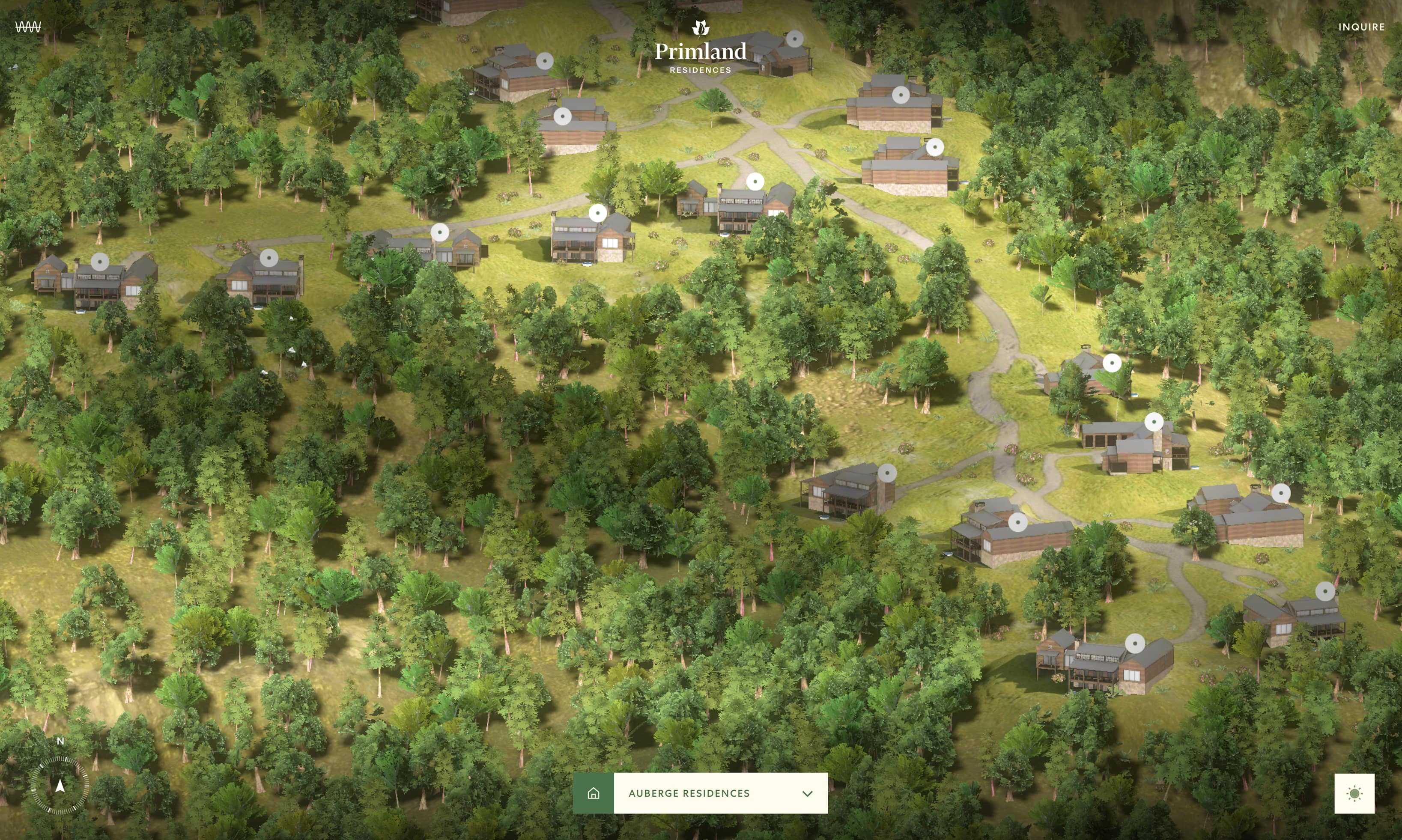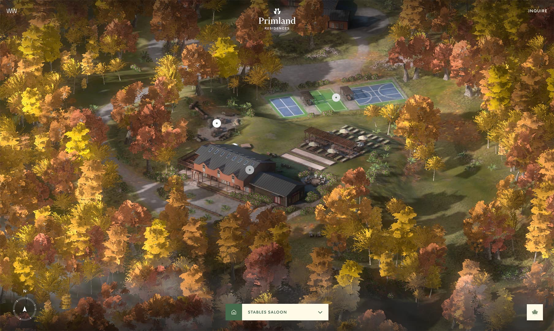 To fully immerse visitors, we added dynamic elements that bring the environment to life—ambient nature sounds, birdsong, fog, drifting clouds, and even the ability to change seasons, allowing users to experience the community year-round. The unique mood of each scene was crafted using a WYSIWYG, fully editable Spline system, giving the team complete control over lighting, cloud movement, foliage density, textures, and even tree colors. This level of art direction allowed us to create a truly expressive and seasonally rich digital representation of Primland.
